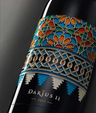 Fact Sheet (Link opens in new window)Derived from a 14th C. AD painted tile, the art adorning 2012 Darius II highlights the evolution of ancient decorative art and architecture. Its infinite shapes and lively color are reminiscent of the ornament of the First Persian Empire, where elaborate palaces throughout the city of Persepolis were decorated in prominent blues, reds, blacks and yellows on glazed tiles. The pyramidal pattern pays further homage to the grand Ziggurats of the 3rd millennium BC, which housed intricate temples for kings and deities. Over the passage of time these design elements flourished, influencing great works from the geometric limestone tomb of Cyrus the Great to Moorish architecture of the Alhambra. Exuding vibrancy and texture, this work fittingly represents 2012 Darius II, a wine deeply rooted in both culture and craft.