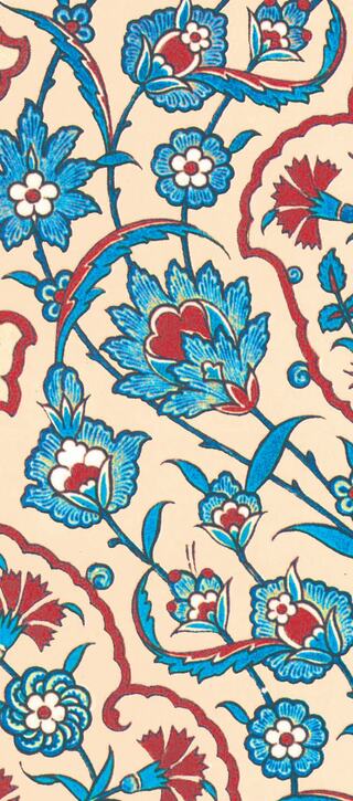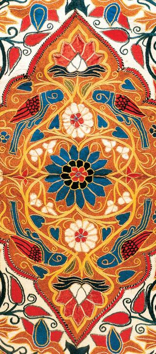 Fact Sheet (Link opens in new window)The rich detail of Khameh-Duzi silk-embroidered broad cloth curtain from 18th century Rasht inspires this artwork. Khameh-Duzi literally translates to English as "cream of the crop," a fitting title and description for what has traditionally been selected to craft the finest, most sacred textiles.