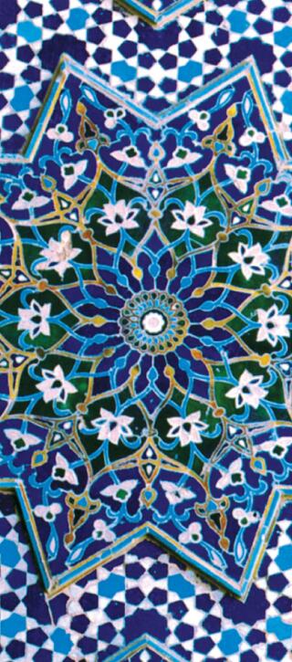 Fact Sheet (Link opens in new window)The magnificent blue mosaic tile ceiling seen on this label covers the north portal of the Darb-e Emam Mausoleum in Isfahan. This 15th century masterpiece is one of a pair, with protruding palmettes and stars encircling a central sun medallion.