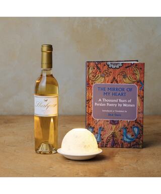 The Serenity Set is a beautifully curated trio designed to soothe the senses and calm the spirit. Perfect for those in need of a quiet escape, this elegant gift collection includes a bottle of our 2019 Late Harvest Shahpar, a beautifully designed porcelain votive by Bernardaud and a captivating book, The Mirror of My Hear, a collection of Persian poems by women.