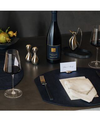 Refined and stylish, this hosting gift boasts a bottle of 2023 Signature Pinot Noir combined with a beautiful small stainless-steel pitcher by Georg Jensen and dinner napkins by Kim Seybert.